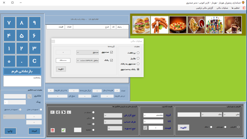 قیمت گذاری :مدیر صندوق می تواند قیمت غذاها یا نوشیدنی را تعریف کند. هنگام صدور فاکتور قیمت ها به طور خودکار در فاکتور درج می شوند.