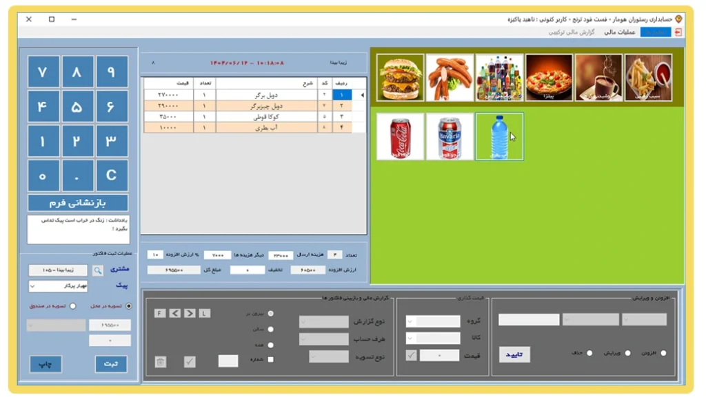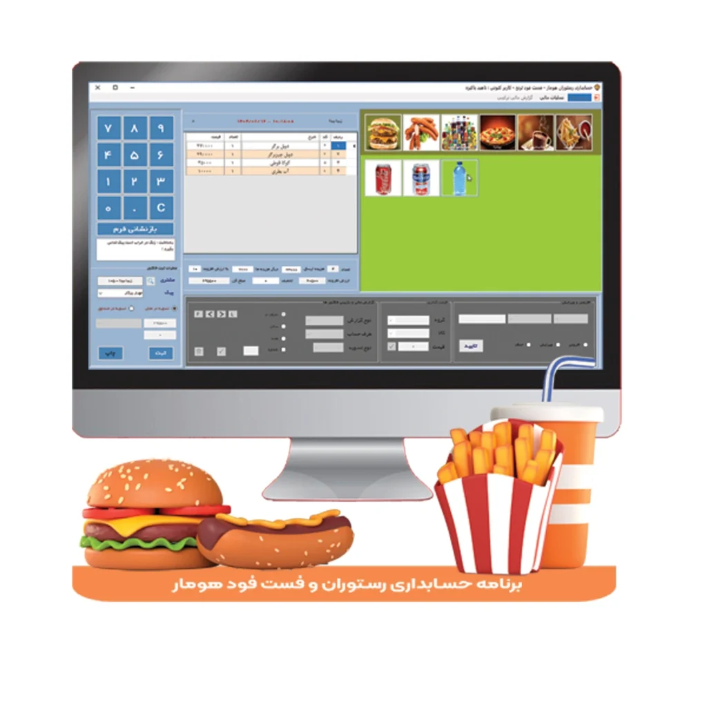 نرم افزار حسابداری هومار ویژه فست فود و رستوران یک محیط کاری زیبا، ساده و کاربر پسند دارد . گروه های غذایی ، نوشیدنی و محصولات با آیکون های درشت و زیبا نمایش داده می شوند.گزینه های صدور فاکتور، انتخاب مشتری ، پیک و چاپ فاکتور به ساده ترین شکل ممکن در یک صفحه در دسترس صندوقدار هستند .